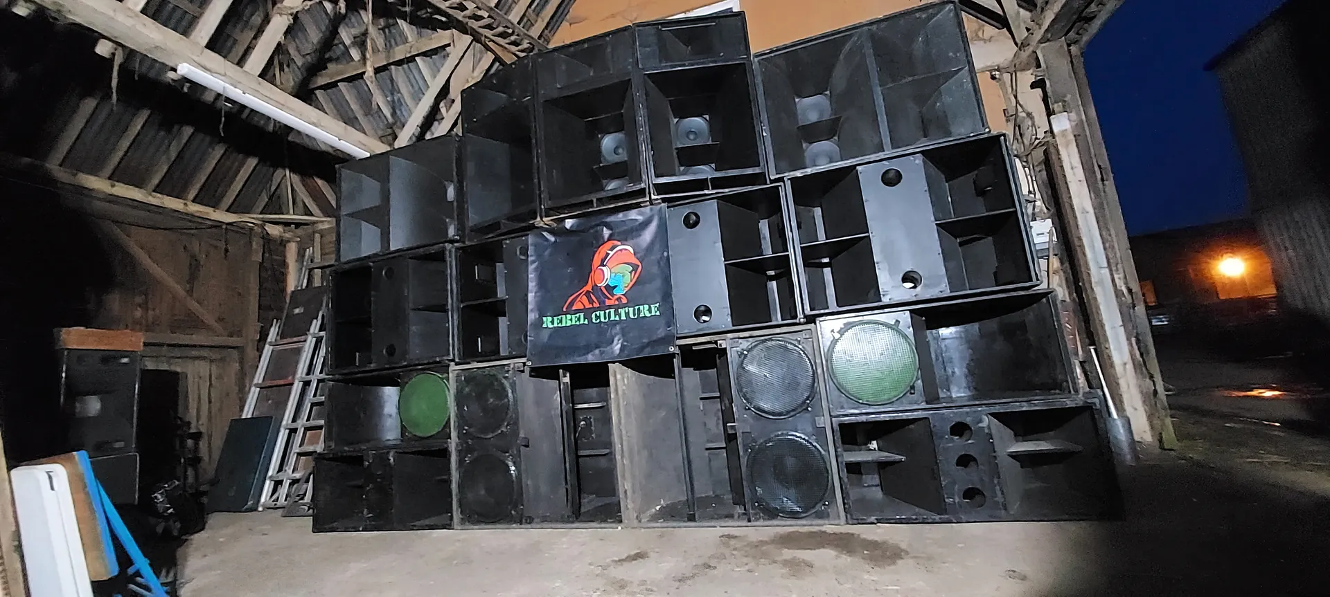 Rebel Culture has been building and running a heavyweight sound system since 2019. What started in a single unit in Aylesbury has grown into a full 15kw rig with custom scaffold stage, Technics, digital control, and a full lighting/laser setup.